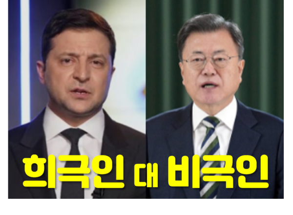 우크라이나 대통령은 국민에게 웃음을 주는 코미디언 즉 희극인이라면, 문재인 대통령은 국민에게 슬픔을 주는 비극인이다.