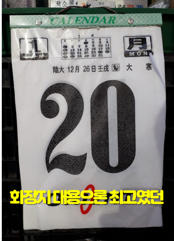 일력 종이는 습자지처럼 앏아서, 화장지 대용으론 최고였다. 당시엔 화장지를 사용하기 힘든 시절이라, 대개 신문지나 잡지책을 찢은 후 열심히 비벼서 사용했는데 불편한 건 사실이었다. 따라서 얇은 일력 종이는 화장지 대용으론 최고였다. 하지만 하루에 한 장만 사용할 수 있으므로 가족간의 경쟁이 심했다. 그러다보니 미리 떼어가서, 일력은 대개 제 날짜보다 며칠씩 앞으로 가 있곤 했다. 어느 해인가 어머니께서 일력을 하나 더 얻어 오셔서, 그 해 일력은 늘 제 날짜를 가리킬 수 있었다.