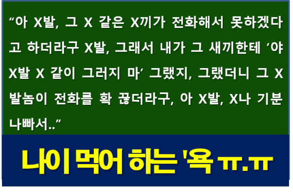 ”아 X발, 그 X 같은 X끼가 전화해서 못하겠다고 하더라구 X발, 그래서 내가 그 X끼한테 ‘야 X발 X 같이 그러지 마’ 그랬지, 그랬더니 그 X발놈이 전화를 확 끊더라구, 아 X발, X나 기분 나빠서...“