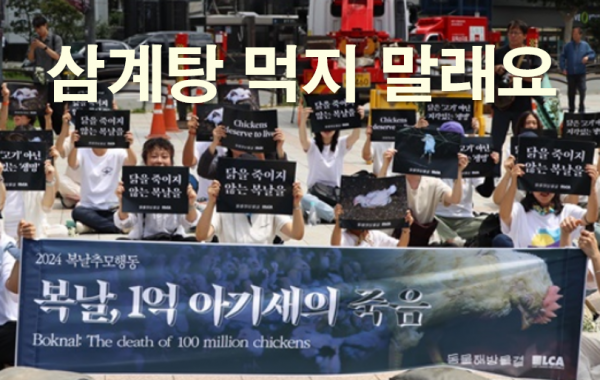초복인 지난 15일 서울 종로구 보신각 앞에서 동물단체 연합인 '2024 복날추모행동'이 닭의 죽음을 반대하는 집회를 가졌다. 이들은 죽어간 닭들을 추모하는 묵념과 헌화 등과 함께 진혼무까지 선보였다. 또한 ‘불결한 환경에서 밀집 사육된 후 도살장으로 실려 간다’며 어린 새들을 애도한 후, 서울 보신각과 광화문 주변 삼계탕·치킨 업소가 밀집된 거리를 행진한 뒤 해산했다.