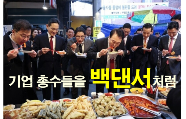 언론에선 윤석열 정부가 부산엑스포 유치전에서 개망신을 당하고 부산 민심이 돌아서자, 벌인 ‘정치쇼’라고 한다. 그렇지 않아도 세계 경제가 위중한 상황인데, 바쁘고 정신없는 기업 총수들을 불러다 모아놓고, 한가하게 시장에서 떡볶이를 먹게 하다니.