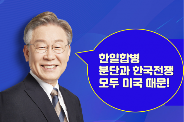 더불어민주당 이재명 대선 후보는 "한국이 일본에 합병된 이유는 미국이 가쓰라-태프트 협약을 통해 승인했기 때문"이라며, "결국에 마지막에 분단도 역시 일본이 분할된 게 아니라 전쟁 피해국인 한반도가 분할되면서 전쟁의 원인이 됐다는 점은 부인할 수 없는 객관적인 사실"이라고 말했다.