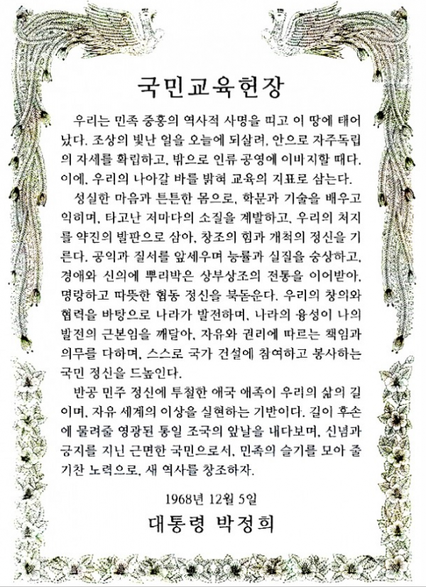 국가의 미래가 교육에 있다고 생각한 박정희 대통령이 1968년 12월 5일에 발표했다. 벌써 53년이나 지났다.