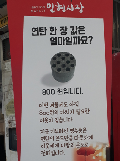 필자가 오후에 자주 찾는 곳이 인현시장이다. 사무실에서도 가깝고 비교적 식사가 저렴하기 때문이다. 그런데 그곳에서 연탄 기부 배너를 보게 되었다. (사진 참조) 요즘 연탄 한 장에 800원이란 사실도 알게 되었다.