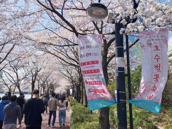 어제(3월 26일) 찾은 석촌호수에는 코로나 이후 처음으로 벚꽃축제를 알리는 ‘호수벚꽃축제’ 현수막이 걸리기 시작했다. (석촌호수 벚꽃은 꽤 유명하다) 4월 5일부터 9일까지란다. 아직도 열흘이나 남았다. 그런데 안타까운 건 이미 벚꽃이 활짝 폈다는 점이다.(사진 참조) 막상 벚꽃축제 기간에는 이미 져버린 벚꽃잎이라도 밟을 수 있으면 다행일 것 같다.