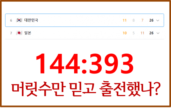 그런데 8월 5일 현재 메달 순위는 대한민국이 자그마치 금메달 11개로 6위, 일본이 금메달 10개로 7위다. 앞으로 어떻게 변할 지 모르겠지만, 지금으로선 일본의 극우 인사와 언론이 헛소리에 가까운 입방정을 떨었다고 할 수 있다.