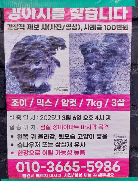 얼마 전 우연히 아파트 정문 벽에 붙은 벽보를 보게 되었다. (사진) 잃어버린 강아지를 찾는다는 내용이었다. 그런데 사례금이 무려 100만원!