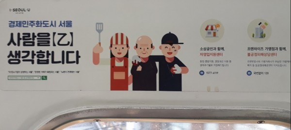 “서울시가 사람 즉 시민을 을(乙)로 생각한다면, 서울시가 갑이란 얘긴가?”하는 생각이 들어 가까이 가서 내용을 자세히 들여다보니, 을(乙)인 소상공인이나 프랜차이즈 업주를 지원하겠다는 내용이다.