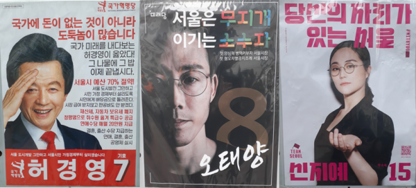 전체적으로 보면 당선 가능성이 높은 후보들은 다소 일반적인, 당선 가능성이 낮은 후보들 일부가 파격적인 포스터를 제작한 게 특징이다.