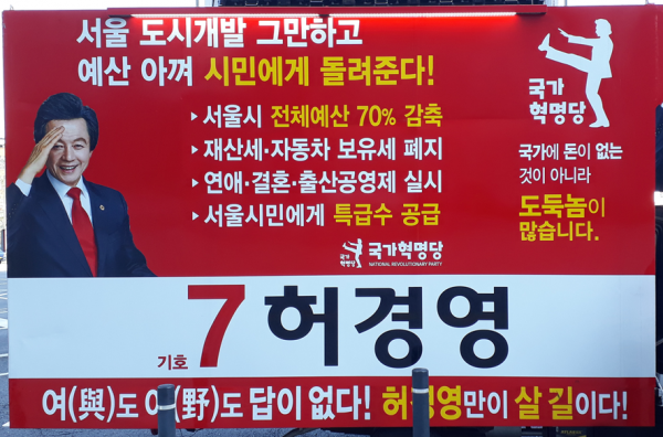 허경영 국가혁명당 후보는 “국가에 돈이 없는 것이 아니라 도둑놈이 많습니다”라며 “서울시 예산을 아껴서 시민에게 돌려준다”고 주장하고 있다. 이것만 봐선 그럴 듯하다.