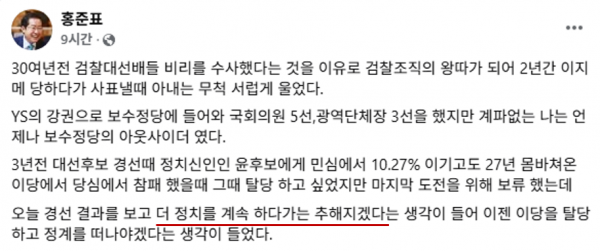 어제 29일 국민의힘 대선후보 2차 경선에서 탈락한 홍준표 후보는 ‘30년 정치인생을 마무리하고 시민으로 돌아가겠다’며 정계 은퇴를 선언했다. 이어 SNS에 "YS(김영삼 전 대통령)의 강권으로 보수정당에 들어와 국회의원 5선, 광역단체장 3선을 했지만 계파 없는 나는 언제나 보수정당의 아웃사이더였다"며 "3년 전 대선 후보 경선 때 정치 신인인 윤석열 당시 후보에게 민심에서 10.27% 이기고도 27년 몸 바쳐온 이 당에서 당심에서 참패했을 때 그때 탈당하고 싶었지만 마지막 도전을 위해 보류했다"고 했다.