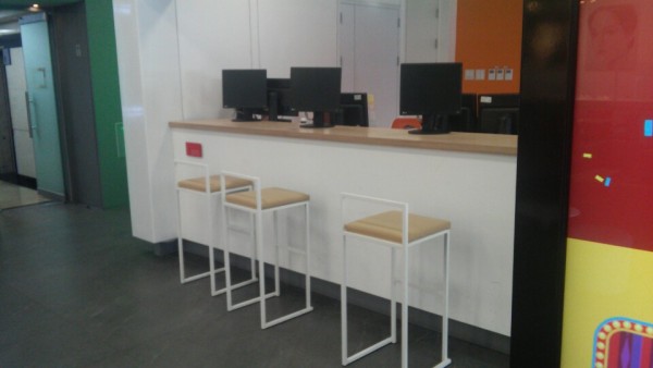 명색이 서비스플라자인데 상담 데스크에 있는 의자는 너무 높고 좁아서 마치 식당의 어린이용 의자를 보는 것 같다. (사진) 역시 품격은 없어 보인다.) 그러다 보니 고객들은 의자가 불편해서, 차라리 서서 상담한다. 짧지도 않은 시간동안 상담을 하는데, 직원은 앉고 고객은 서는 구조다.