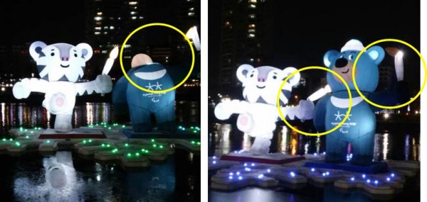 그런데 어느 날 밤, 이 곳에 산책 나갔다가 깜짝 놀랐다. 반다비의 머리가 없어지고 팔도 안 보이는 것이다. 정말 흉측했다. 며칠 후 복원되긴 했지만, 얼마 지나지 않아 이번엔 반다비가 성화를 든 팔의 조명이 나가고 성화봉 한쪽이 터졌는지 조명이 한쪽으로 새어 나오는 것처럼 보였다. 또 수호랑의 성화는 아예 꺾여 있다.