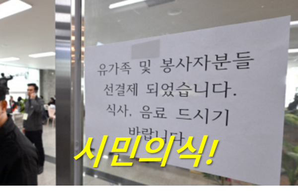 이렇게 시민의식이 높아졌다고 자부하고 있을 무렵, ‘싹쓸이파’가 나타나 시민들의 공분을 사고 있다. 최근 제주항공 사고와 관련해 무안공항에는 분향소와 유가족과 봉사자들을 무료 지원센터가 설치되어 있다. 그런데 일부 추모객들이 합동분향소를 참배한 뒤 컵라면, 음료수, 물티슈, 화장지, 세면도구, 보건용 마스크 양말, 속옷, 수건 등 생필품을 쓸어갔다고 한다. 그런 ‘싹쓸이파’ 중엔 심지어 수도권에서 내려온 추모객도 있다고 한다.