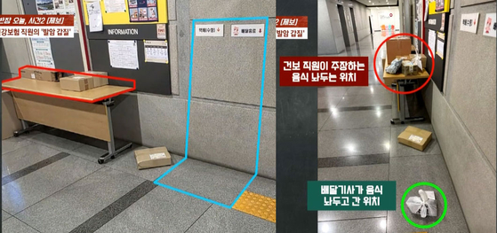 배달 기사 A씨는 지난 24일 국민건강보험공단의 한 지역본부에 음식 배달을 갔다. 당시 손님의 요청 사항에는 ‘6층 엘리베이터 앞에 놔주세요’라고 적혀 있었고, 엘리베이터 옆에는 ‘택배 수령’, ‘배달 음료’라는 안내 표시가 벽에 붙어 있었다. A씨는 당연히 해당 안내 표시 밑에 배달 음식을 놓아야 하는 줄 알았고, 배달한 음식의 인증 사진을 찍은 뒤 현장을 떠났다. (사진 참조)