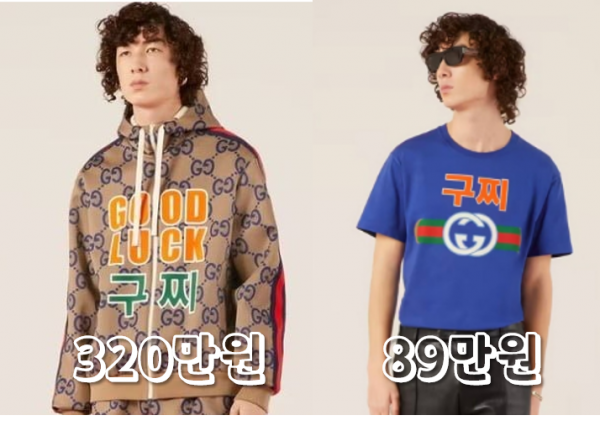 그런데 사진의 스웨트 후드 셔츠 제품 가격이 자그마치 320만원에, 반팔 티셔츠는 89만원! 구찌는 "유서 깊은 모노그램에 맥시멀한 감성을 담았다. 영어와 한국어로 각각 쓰인 패치로 매력을 강조했다"고 소개했다.